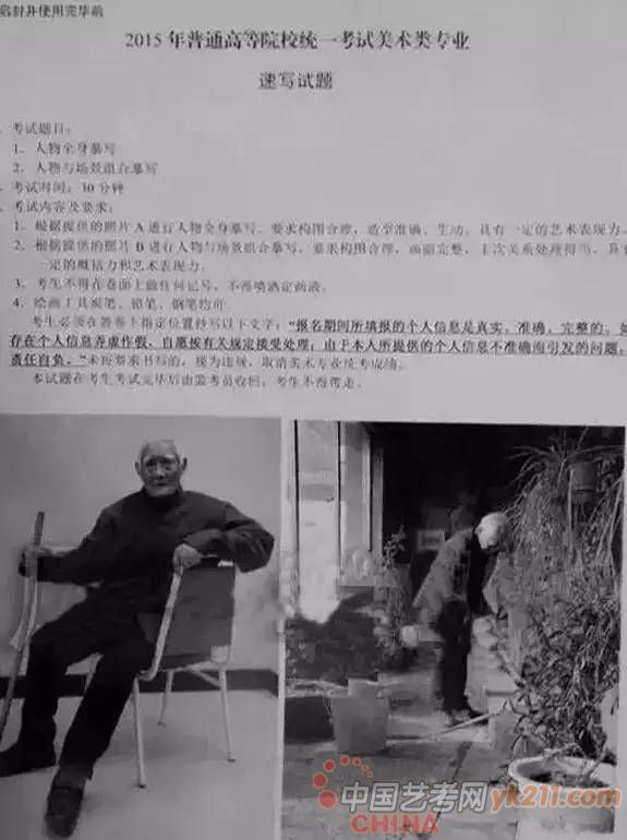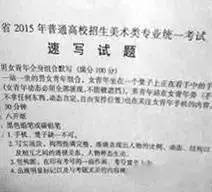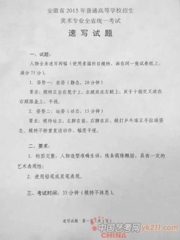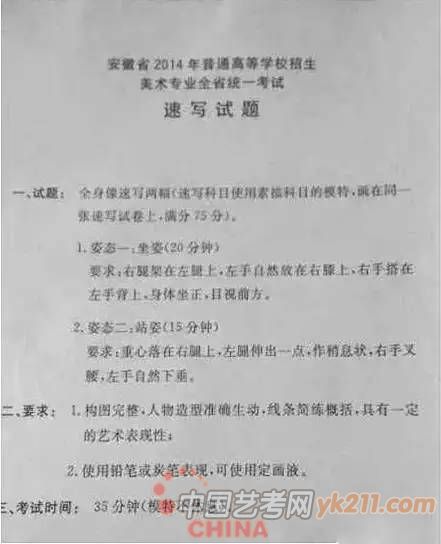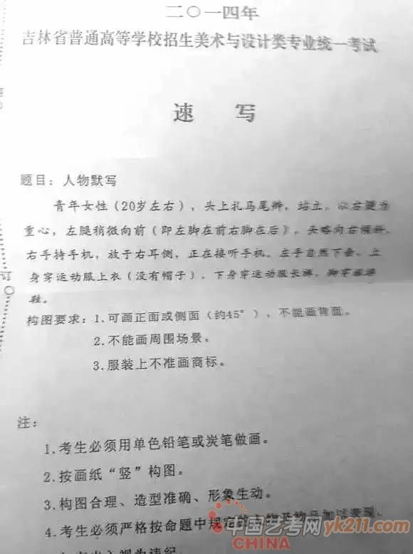 2012年:默写,女青年坐姿,自然刘海,直发马尾辫,免冠,不戴眼镜,身着冬天穿的棉大衣(短款)或羽绒服(短款),牛仔裤,运动鞋,左手扶着膝盖,右手自然放在腿上,左脚在前,只能画正面或斜45度角,不能画背面。(30分钟,8开)