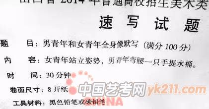 2014年:默写,在桶装水的分销店里,一个工人把一桶水扛在肩上(站姿,男性)一个工人正在休息(坐姿,男性)。可以加上与情节有关的道具和环境,组成一幅完整的画面。(30分钟,8开)