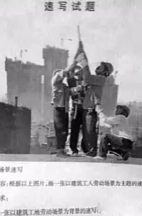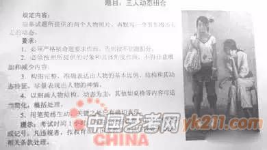 2013年:和往年不一样的是加入了情景设计要求。要求考生用一只鸡做道具,默写两个人,一个站姿,一个蹲姿,设计一个情景,讲个故事,让人有联系。(30分钟,8开)