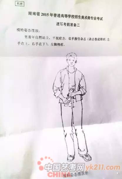 2011年:默写,男青年侧面站姿,短发免冠,双手自然下垂露袖口,身穿羽绒服,下身穿着牛仔裤。脚穿运动鞋,重心落在右脚,要有人物动态。(30分钟,8开)