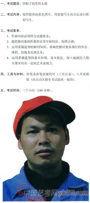 色彩试题(参考样卷) 一、考试题目:色彩静物默写。 二、考试内容:葡萄酒一瓶,盛有红酒的高脚玻璃酒杯一个,白瓷盘一个,水果刀一把,梨子一个,香蕉两个,苹果三个,衬布两块。 三、考试要求: 1.根据考试内容提供的物品自定构图,自由组合,完成一幅色彩静物画。考试内容不得随意增加或减少; 2.造型准确,色彩明快,色调和谐,画面完整,有一定的艺术表现力; 3.不得在试卷上喷洒任何固定液体。 四、工具与材料:水粉或水彩表现均可(工具自备);八开水粉纸(由自治区招生考试院统一提供)。 五、考试时间:三小时(180分钟)