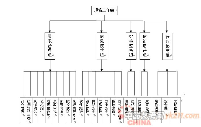 行政秘书组:负责录取场地的安排和安全保卫;为录取工作提供后勤保障;负责协助领导小组做好相关协调工作;负责招生录取宣传工作等。