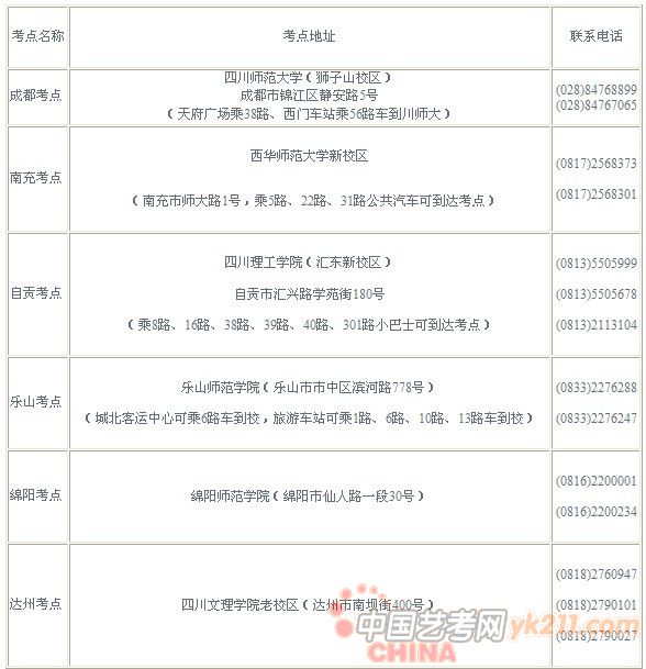 注:今年仍实行分片区考试,成都市、雅安市、资阳市、阿坝州、甘孜州的考生必须在成都考点参加专业考试;南充市、广安市、遂宁市的考生必须在南充考点参加专业考试;自贡市、内江市、泸州市、宜宾市的考生必须在自贡考点参加专业考试;乐山市、眉山市、攀枝花市、凉山州的考生必须在乐山考点参加专业考试;绵阳市、德阳市、广元市的考生必须在绵阳考点参加专业考试;达州市、巴中市的考生必须在达州考点参加专业考试。请考生在网报和确认时严格按照上述规定进行填报及确认。错报、乱跑考点影响专业考试的考生后果自负。 四、报名手续及办法 1. 文考报名手续及办法 (1) 凡符合报考条件的考生凭县(市、区)招办发放的用户名和密码,自行登录报名网站,按报名网站上的提示和要求如实填写本人报名信息。输入的内容应真实、准确,姓名、族别、年龄等以《身份证》为准。在网上报名期间内,考生可自行修改、校正网报个人信息。 (2) 考生须持本人《身份证》、高级中等教育学校毕业证书或同等学力的证明到县(市、区)招办进行核实,并确认基础信息无误后,由县(市、区)招办组织专人用电子数码摄像采集考生图像信息。考生基础信息一经本人确认签字后,不得再更改。因输入、确认失误造成的后果,由考生本人负责。 (3) 考生在确认基础信息后,由县(市、区)招办签发《四川省2011年[FS:PAGE]普通高等学校艺术、体育类专业招生报考证》(以下简称《报考证》)。 考生必须仔细核对《报考证》上打印的考生号、姓名、身份证号、美术统考考点等信息是否准确,照片是否清晰。如果发现有误应立即要求县(市、区)招办予以更改,否则将会影响专业考试。 所有考生必须在规定时间内本人到户口所在地县(市、区)招办进行报名确认,不能代为确认,过时不再补办。凡未办理艺术类文考报名手续的考生,不得参加艺术类专业考试及录取。遗留问题由考生自己负责。 2. 专业考试报名手续及办法 考生在专业考试报名时,须持县(市、区)招办签发的《报考证》和《身份证》于规定时间内到专业考点(按《报名卡》上填涂的考点)报名,按省规定的标准缴纳专业报名考试费并签订《专业考试诚信承诺书》,领取专业考试《准考证》。凡未携带《身份证》的考生不得参加专业报名、考试,遗留问题责任自负。 考生在报名时应认真填写《四川省普通高等学校艺术、体育类招生专业考试报名登记表》,考生号和姓名必须与《报考证》上一致。 五、专业考试 专业考试科目及范围: (1) 素描:静物或人物;(2) 速写:人物动态;(3) 色彩:风景或静物。 专业考试日程安排: